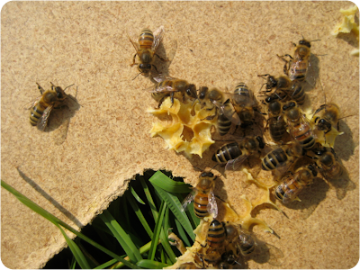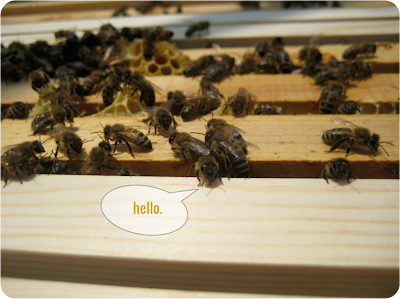 First of all, I apologize for that title. Jesse made me do it.But it's true! The bees are here! I drove early Tuesday morning to Mount Sterling to pick up two nucs. Nucs are basically several frames of bees that have been removed from a thriving hive and then either given a new queen or make their own. We had a thrilling two hour drive back to the farm, as a handful escaped inside the car and were not too happy. It was a pretty bad day for the bees, altogether...dark and rainy...their least favorite kind of weather. I opened up the nuc boxes and set them on top of their new homes for a while before removing the frames and placing them inside.This very sunny morning, I checked inside the hives to make sure everything looked normal....and I found much happier bees! They were very busy and didn't pay much attention to me at all. It is such a joy to me! It seems like I have been waiting forever, since sitting on my floor months ago putting their hives together. And now I am sitting on the ground next to the hives, buzzing with life, and just watching. They are truly the most amazing little things. They are the reason I first became interested in food and in farming. I love them so much already.- Hannah.